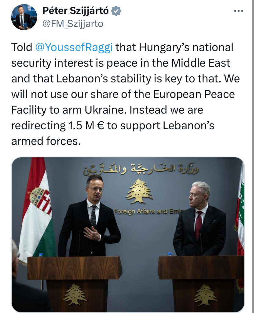 უნგრეთი ევროპული სამშვიდობო ფონდის ერთ-ნახევარ მილიონიან წილს, უკრაინის შეიარაღებული ძალების ნაცვლად, ლიბანის არმიის მხარდასაჭერად გაგზავნის. ამის თაობაზე სოციალურ ქსელ X-ზე უნგრეთის საგარეო საქმეთა მინისტრმა დაწერა. პიტერ სიიარტოს თქმით, ახლო აღმოსავლეთში მშვიდობის ხილვა უნგრეთის ეროვნულ ინტერესებში შედის.