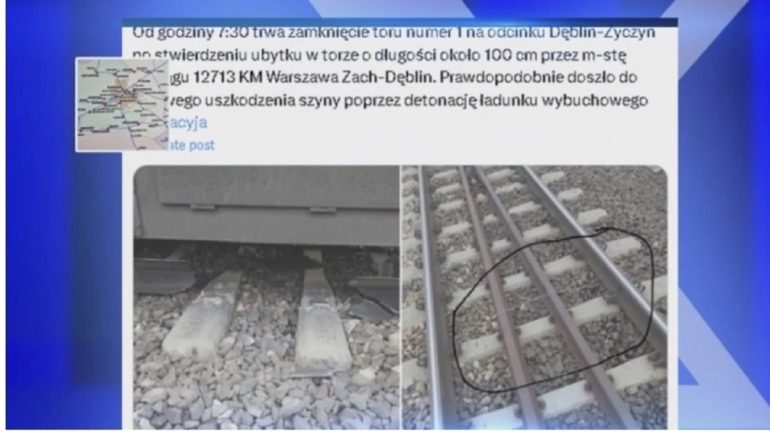 ვარშავასა და დემბლინს შორის, პოლონეთი-უკრაინის მთავარ დამაკავშირებელ სარკინიგზო არტერიაზე უცნობმა პირებმა რელსი დააზიანეს. სავარაუდო აფეთქების შესახებ ინფორმაცია პოლიციას მემანქანემ მიაწოდა.