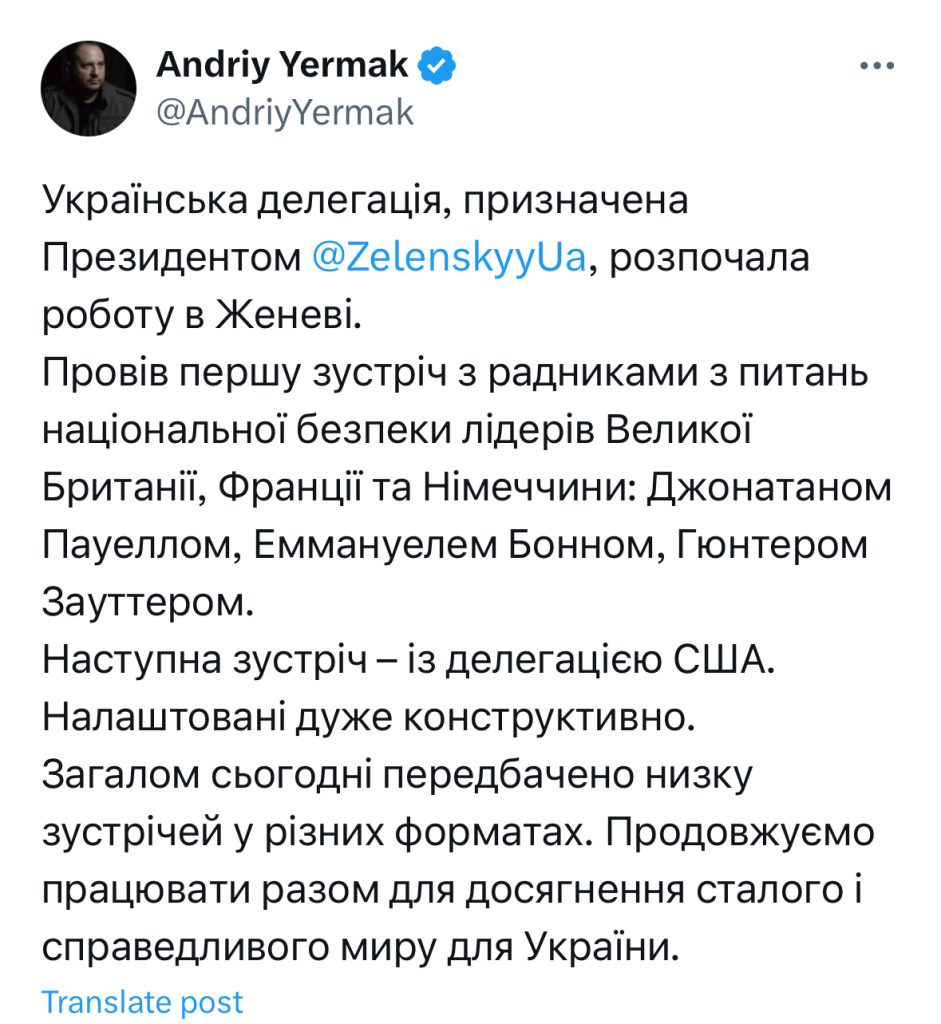 „ძალიან კონსტრუქციულად ვართ განწყობილები. საერთო ჯამში, დღეს გათვალისწინებულია მთელი რიგი შეხვედრები სხვადასხვა ფორმატში. ვაგრძელებთ ერთად მუშაობას უკრაინისთვის მდგრადი და სამართლიანი მშვიდობის მისაღწევად“, – აღნიშნა ერმაკმა.