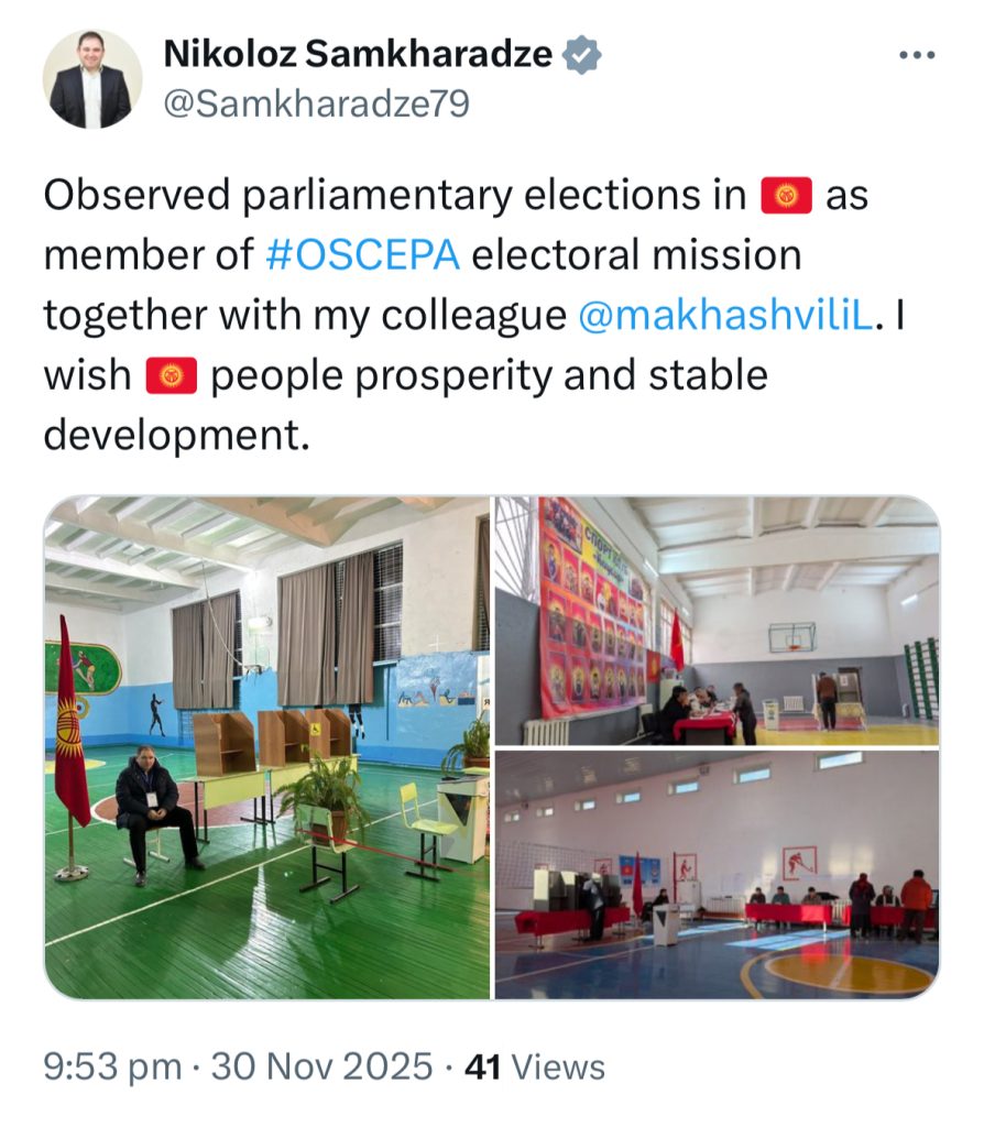 საქართველოს პარლამენტის საგარეო ურთიერთობათა კომიტეტის თავმჯდომარე, ნიკოლოზ სამხარაძე x-ზე პოსტს აქვეყნებს, რომელშიც წერს, რომ მის კოლეგასთან, ლევან მახაშვილთან ერთად ეუთოს საპარლამენტო ასამბლეის საარჩევნო მისიის ფარგლებში ყირგიზეთის საპარლამენტო არჩევნებს დააკვირდა.