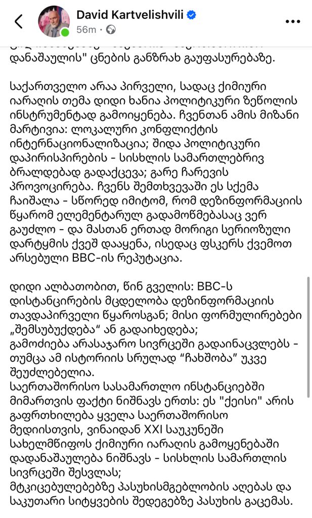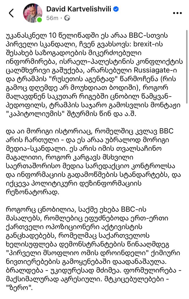 დავით ქართველიშვილი: ეს არაა BBC-სთვის პირველი სკანდალი, ჩვენ გვახსოვს ისრაელ-პალესტინის კონფლიქტის ცალმხვრივი გაშუქება და ტრამპის “რუსეთის აგენტად” წარმოჩენა