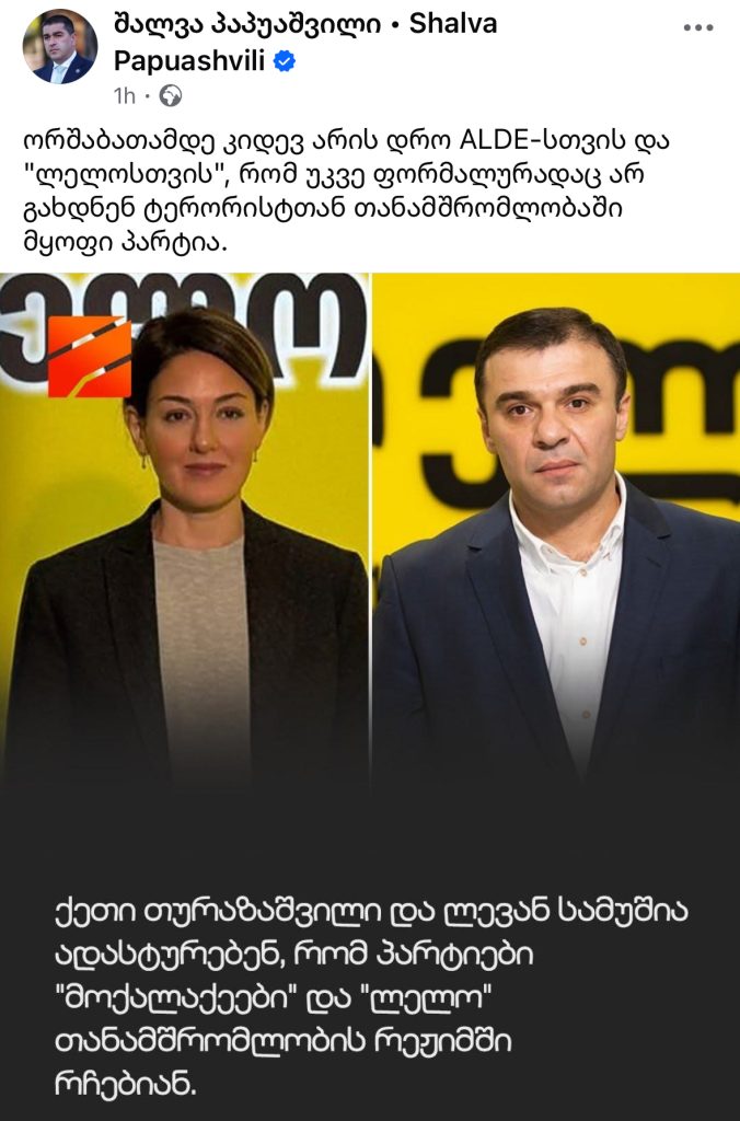 „ორშაბათამდე კიდევ არის დრო ALDE-სთვის და „ლელოსთვის“, რომ უკვე ფორმალურადაც არ გახდნენ ტერორისტთან თანამშრომლობაში მყოფი პარტია“, – წერს პაპუაშვილი.