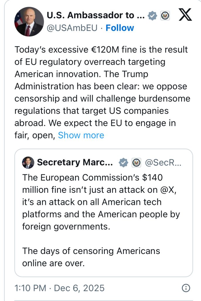 „ტრამპის ადმინისტრაციამ ნათლად განაცხადა: ჩვენ ვეწინააღმდეგებით ცენზურას და გავასაჩივრებთ დამამძიმებელ რეგულაციებს, რომლებიც სამიზნეში იღებს საზღვარგარეთ აშშ-ის კომპანიებს. ველოდებით, რომ ევროკავშირი ჩაერთვება ღია, სამართლიან და ორმხრივ ვაჭრობაში“, – წერს ელჩი.