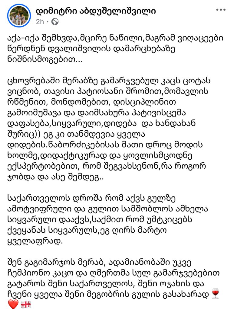 დიმიტრი აბდუშელიშვილი სოციალურ ქსელში პოსტს აქვეყნებს.