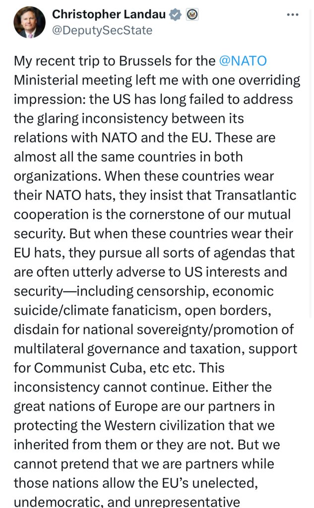 „ეს თითქმის ერთი და იგივე ქვეყნები არიან ორივე ორგანიზაციაში. როდესაც ეს ქვეყნები ნატოს ქუდს იხურავენ, ისინი ამტკიცებენ, რომ ტრანსატლანტიკური თანამშრომლობა ჩვენი საერთო უსაფრთხოების ქვაკუთხედია. მაგრამ როდესაც ეს ქვეყნები ევროკავშირის ქუდს იხურავენ, ისინი ახორციელებენ ყველა სახის დღის წესრიგს, რომელიც ხშირად სრულიად ეწინააღმდეგება აშშ-ის ინტერესებსა და უსაფრთხოებას – მათ შორის არის ცენზურა, ეკონომიკური სუიციდი/კლიმატური ფანატიზმი, ღია საზღვრები, ეროვნული სუვერენიტეტის უგულებელყოფა/მულტილატერალური მმართველობისა და გადასახადების ხელშეწყობა, კომუნისტური კუბის მხარდაჭერა და ა.შ. ეს შეუსაბამობა ვერ გაგრძელდება“, – აღნიშნა კრისტოფერ ლანდაუმ.