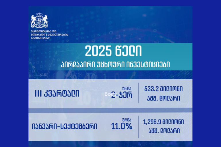 ეკონომიკის სამინისტრო: მიმდინარე წლის მესამე კვარტალში პირდაპირი უცხოური ინვესტიციები 2-ჯერ გაიზარდა და 533.2 მილიონი აშშ დოლარი შეადგინა