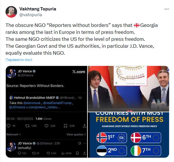 „ფაქტმონიტორის“ ანალიტიკოსი ვახტანგ თოფურია ორგანიზაციის “რეპორტიორები საზღვრებს გარეშე” ანგარიშს X-ზე ეხმიანება, რომლის თანახმადაც, საქართველო ევროპაში პრესის თავისუფლების მიხედვით ბოლოდან მე-4 ადგილზე იმყოფება.