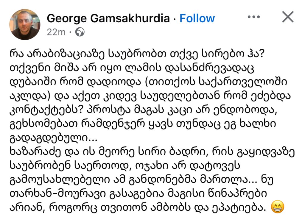 ”რა არაბიზაციაზე საუბრობთ თქვე სირებო ჰა? თქვენი მიშა არ იყო ლამის დასანძრევადაც დუბაიში რომ დადიოდა (თითქოს საქართველოში აკლდა) და აქეთ კიდევ საუდელებთან რომ ეძებდა კონტაქტებს? პროსტა მაგას კაცი არ ენდობოდა, გეხსომებათ რამდენჯერ ყავს თუნდაც ეგ ხალხი გადაგდებული…