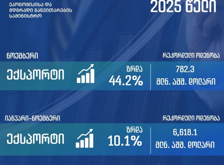 მათივე ცნობით, ჯამურად იანვარ-ნოემბერში ექსპორტი 10.1%-ით გაიზარდა, გადააჭარბა 2024 წლის წლიურ მონაცემს და ასევე რეკორდულ ოდენობას 6,618.1 მლნ. აშშ. დოლარს გაუტოლდა.