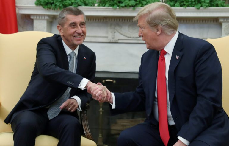 აშშ-ის პრეზიდენტი დონალდ ტრამპი ანდრეი ბაბიშს ჩეხეთის პრემიერ-მინისტრად ხელახლა დანიშვნას ულოცავს.