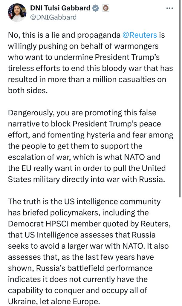 „არა, ეს ტყუილია და პროპაგანდაა, რომელსაც „როიტერი“ ნებაყოფლობით უჭერს მხარს ომის მომხრეების სახელით, რომლებსაც სურთ პრეზიდენტ ტრამპის დაუღალავი ძალისხმევის ძირის გამოთხრა, რათა დაასრულონ ეს სისხლიანი ომი, რომელმაც ორივე მხრიდან მილიონზე მეტი მსხვერპლი გამოიწვია. სახიფათოა, რომ თქვენ ამ ცრუ ნარატივსავრცელებთ პრეზიდენტ ტრამპის სამშვიდობო ძალისხმევის დასაბლოკად და ხალხში ისტერიასა და შიშს აღვივებთ, რათა მათ ომის ესკალაციას დაუჭირონ მხარი, რაც ნატო-სა და ევროკავშირს რეალურად სურთ, რათა შეერთებული შტატების სამხედროები პირდაპირ რუსეთთან ომში ჩაითრიონ. სიმართლე ის არის, რომ აშშ-ის სადაზვერვო სამსახურმა პოლიტიკის შემქმნელებს, მათ შორის დემოკრატ წევრს, რომლის ციტირებასაც „როიტერი“ ახორციელებდა, აცნობა, რომ აშშ-ის დაზვერვის შეფასებით, რუსეთი ნატო-სთან უფრო ფართომასშტაბიანი ომის თავიდან აცილებას ცდილობს. ის ასევე აფასებს, რომ როგორც ბოლო რამდენიმე წელია, ჩანს, რუსეთის საბრძოლო მოქმედებები მიუთითებს, რომ მას ამჟამად არ აქვს მთელი უკრაინის დაპყრობისა და ოკუპაციის შესაძლებლობა, რომ აღარაფერი ვთქვათ, ევროპის დაპყრობაზე.“- წერს გაბარდი.