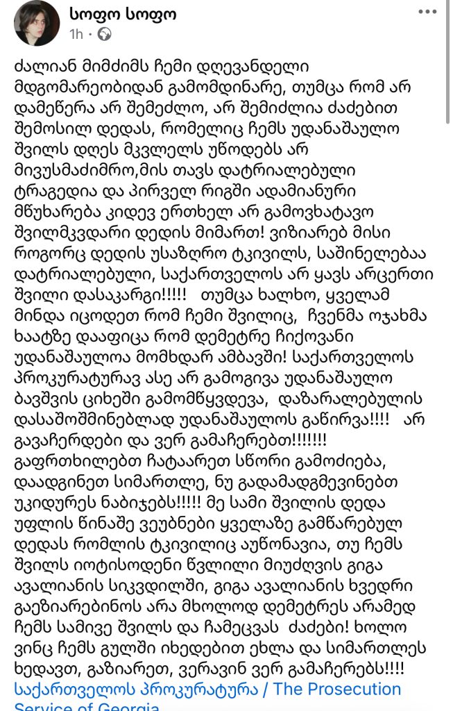 “არ შემიძლია ძაძებით შემოსილ დედას, რომელიც ჩემს უდანაშაულო შვილს მკვლელს უწოდებს არ მივუსამძიმრო…”