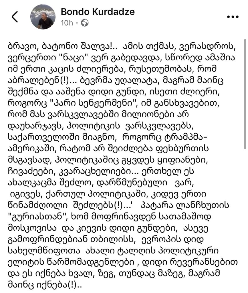 ბონდო ქურდაძე: ამის თქმას ვერცერთი “ნაცი” ვერ გაბედავდა, სწორედ ამაშია იმ ერთი კაცის ძლიერება, რუსეთუმობას რომ აბრალებენ