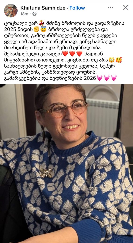 ”ცოცხალი ვარ💃 მძიმე ბრძოლის და გადარჩენის 2025 მიდის✊😇 ბრძოლა გრძელდება და ღმერთით, გამოჯანმრთელების წელს ვხვდები ყველა იმ ადამიანთან ერთად, ვინც სასწაული მოახდინეთ წელს და ჩემი მკურნალობა შესაძლებელი გახადეთ❤️❤️❤️ ძალიან მიყვარხართ თითოეული, გიცნობთ თუ არა🥹🥰 სასწაულების წელი გვქონდეს ყველას, სუპერ კარგი ამბების, ჯანმრთელად ყოფნის, გამარჯვებების და ბედნიერების 2026💓💓💓”