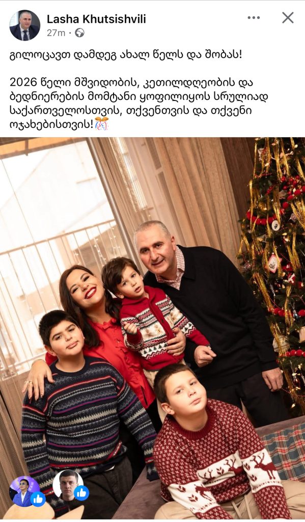 პოლიტიკა “2026 წელი მშვიდობის, კეთილდღეობის და ბედნიერების მომტანი ყოფილიყოს სრულიად საქართველოსთვის” 31.12.2025 19:46:17 ShareTweetSharePin ფინანსთა მინისტრი ლაშა ხუციშვილი მოსახლეობას ახალ წელს ულოცავს. “გილოცავთ დამდეგ ახალ წელს და შობას! 2026 წელი მშვიდობის, კეთილდღეობის და ბედნიერების მომტანი ყოფილიყოს სრულიად საქართველოსთვის, თქვენთვის და თქვენი ოჯახებისთვის!🎊” კომენტარები ShareTweetSharePin ნანახია: 6 ჯერ