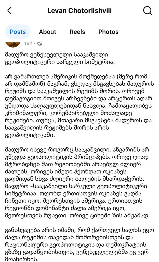 ის პარალელს ავლებს მიხეილ სააკაშვილთან და ამბობს, რომ მადურო-სააკაშვილი სარკული გეოპოლიტიკური სიმეტრიაა, რომლებიც ღიად მტრობდნენ მათ რეგიონებში არსებულ ძლიერ ძალებს.