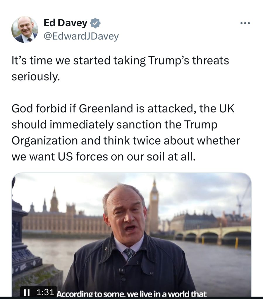 დროა ტრამპის მუქარები სერიოზულად მივიღოთ. ღმერთმა ნუ ქნას, მაგრამ თუ გრენლანდიაზე თავდასხმა განხორციელდება, დიდმა ბრიტანეთმა დაუყოვნებლივ უნდა დააწესოს სანქციები ტრამპის ორგანიზაციის წინააღმდეგ და სერიოზულად დაფიქრდეს, საერთოდ გვინდა თუ არა აშშ-ის სამხედრო ძალების ყოფნა ჩვენს ტერიტორიაზე, – ამის შესახებ დიდი ბრიტანეთის ლიბერალ-დემოკრატების ლიდერი, ედ დეივი, X-ზე გამოქვეყნებულ მიმართვაში აცხადებს.