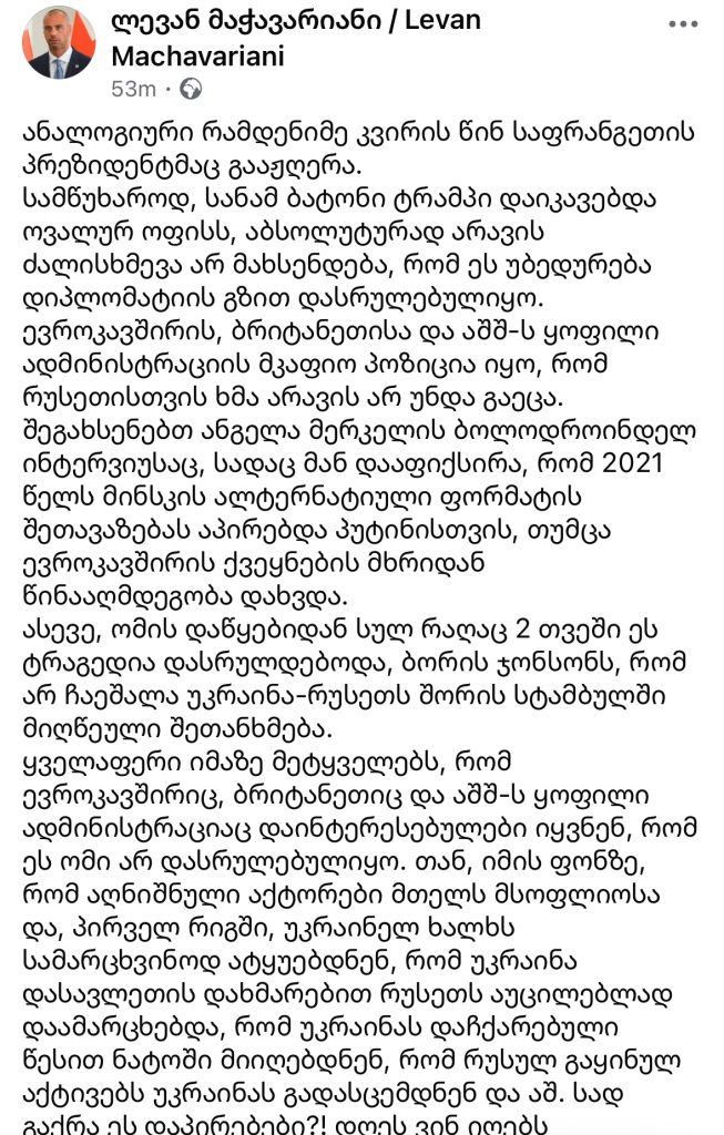 ლევან მაჭავარიანი ამბობს, რომ სანამ დონალდ ტრამპი ოვალურ ოფისს დაიკავებდა, არავის ძალისხმევა არ ახსენდება, რომ „ეს უბედურება დიპლომატიის გზით დასრულებულიყო“.