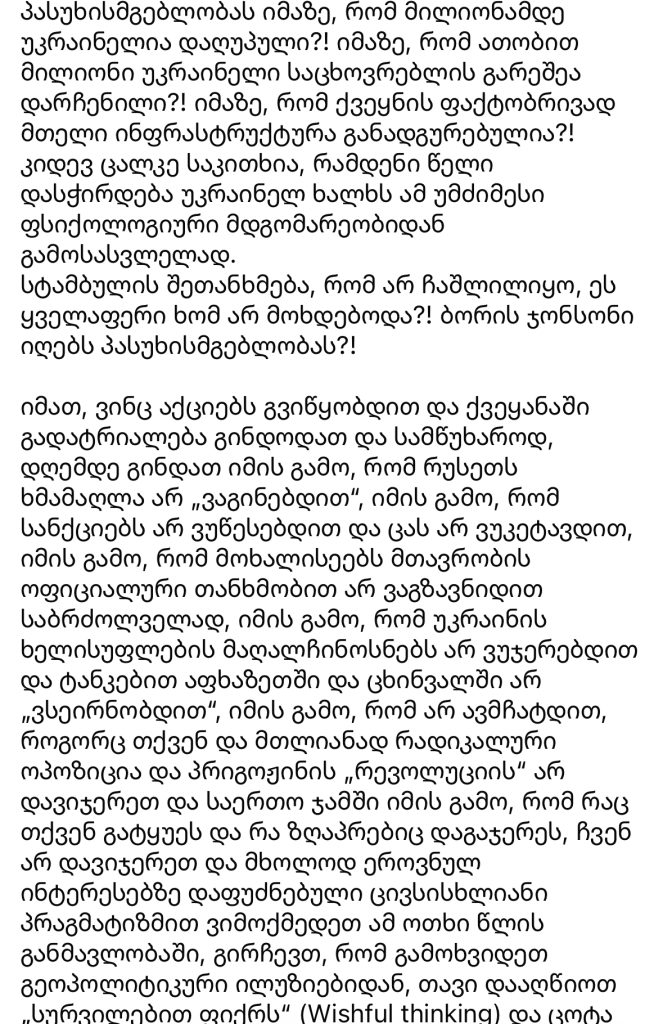 იმათ, ვინც აქციებს გვიწყობდით და ქვეყანაში გადატრიალება გინდოდათ და სამწუხაროდ დღემდე გინდათ იმის გამო, რომ რუსეთს ხმამაღლა არ „ვაგინებდით”, იმის გამო, რომ სანქციებს არ ვუწესებდით და ცას არ ვუკეტავდით, იმის გამო, რომ მოხალისეებს მთავრობის ოფიციალური თანხმობით არ ვაგზავნიდით საბრძოლველად, იმის გამო, რომ უკრაინის ხელისუფლების მაღალჩინოსნებს არ ვუჯერებდით და ტანკებით აფხაზეთში და ცხინვალში არ „ვსეირნობდით”, იმის გამო, რომ არ ავმჩატდით, როგორც თქვენ და მთლიანად რადიკალური ოპოზიცია და პრიგოჟინის „რევოლუციის” არ დავიჯერეთ და საერთო ჯამში იმის გამო, რომ რაც თქვენ გატყუეს და რა ზღაპრებიც დაგაჯერეს, ჩვენ არ დავიჯერეთ და მხოლოდ ეროვნულ ინტერესებზე დაფუძნებული ცივსისხლიანი პრაგმატიზმით ვიმოქმედეთ ამ 4 წლის განმავლობაში, გირჩევთ, რომ გამოხვიდეთ გეოპოლიტიკური ილუზიებიდან, თავი დააღწიოთ „სურვილებით ფიქრს” (wishful thinking) და ცოტა კრიტიკული აზროვნება დაიწყოთ“, – წერს მაჭავარიანი.