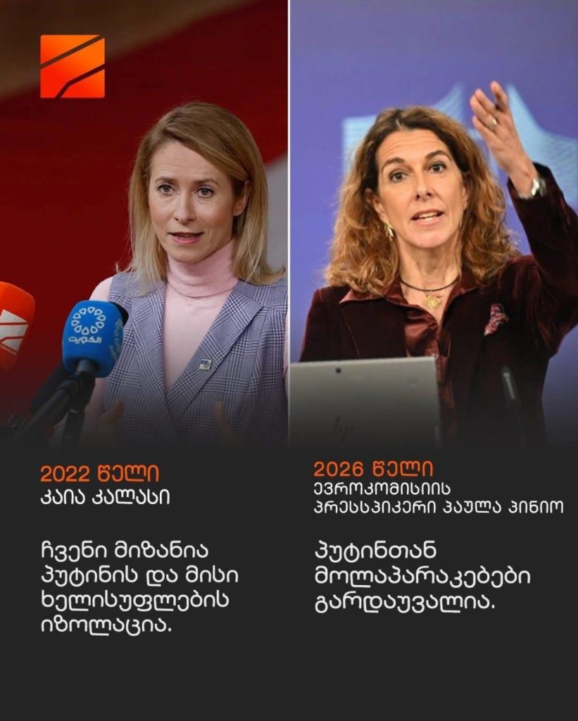ფრაქცია „ქართული ოცნების“ თავმჯდომარის პირველი მოადგილე ლევან მაჭავარიანი 2022 წელს კაია კალასის და 2026 წელს ევროკომისიის პრესსპიკერის პაულა პინიოს განცხადებებს ეხმიანება, სადაც პირველ შემთხვევაში პუტინის იზოლაციაზე, ხოლო ახლა მასთან მოლაპარაკებების გამართვაზეა საუბარი.