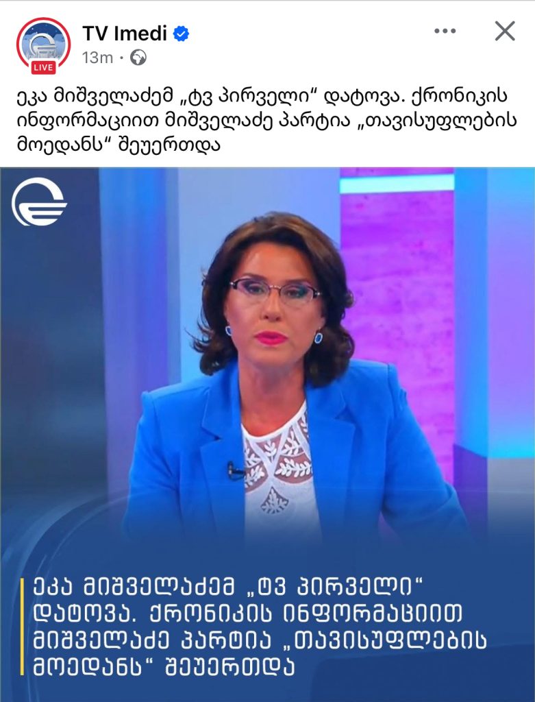 მასმედია ეკა მიშველაძემ „ტვ პირველი“ დატოვა 14.01.2026 23:31:38 ShareTweetSharePin ეკა მიშველაძემ „ტვ პირველი“ დატოვა. ქრონიკის ინფორმაციით მიშველაძე პარტია „თავისუფლების მოედანს“ შეუერთდა. კომენტარები ShareTweetSharePin ნანახია: 19 ჯერ