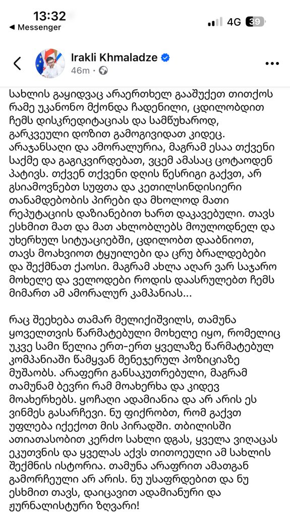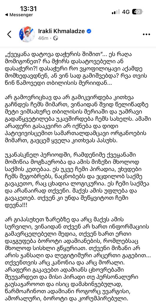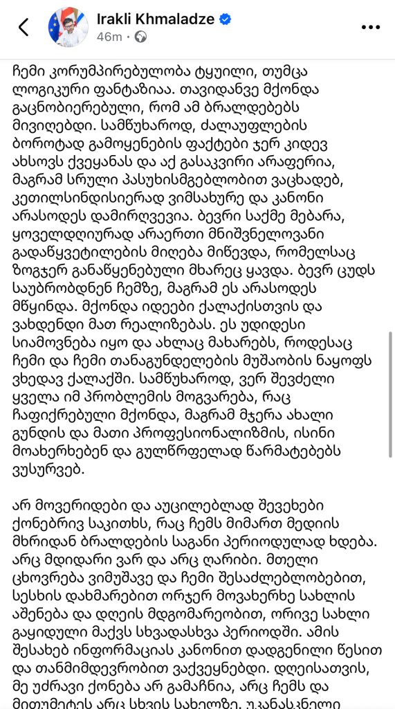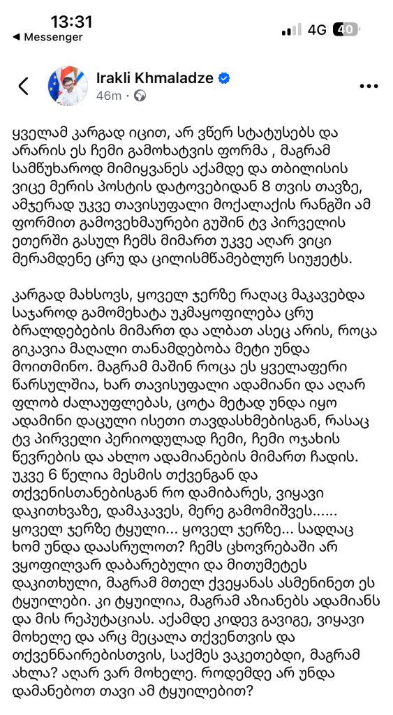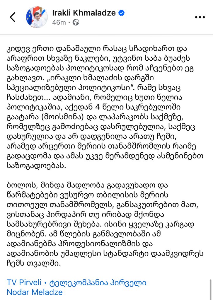 ”ყველამ კარგად იცით, არ ვწერ სტატუსებს და არარის ეს ჩემი გამოხატვის ფორმა , მაგრამ სამწუხაროდ მიმიყვანეს აქამდე და თბილისის ვიცე მერის პოსტის დატოვებიდან 8 თვის თავზე, ამჯერად უკვე თავისუფალი მოქალაქის რანგში ამ ფორმით გამოვეხმაურები გუშინ ტვ პირველის ეთერში გასულ ჩემს მიმართ უკვე აღარ ვიცი მერამდენე ცრუ და ცილისმწამებლურ სიუჟეტს.