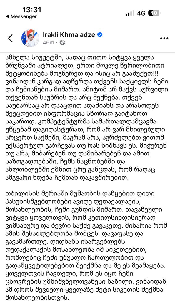 ამხელა სიუჟეტში, სადაც თითო სიტყვა ყველა ბრუნვაში ატრიალეთ, ერთი მოკლე წერილობითი შეტყობინება მოგწერეთ და ისიც არ გააშუქეთ!!! ვინაიდან კარგად აღწერდა თქვენს საქციელს ჩემი და ჩემიანების მიმართ. ამიტომ არ მაქვს სურვილი თქვენთან საუბრის და არც მექნება. თქვენ საუბარსაც არ დააცდით ადამიანს და არასოდეს შეეცდებით ინფორმაცია სწორად გაიტანოთ საჯაროდ. კომპეტენტურმა სამართალდამცავმა უწყებამ დაგიდასტურათ, რომ არ ვარ მხილებული არცერთ საქმეში, მაგრამ არა, აგრძელებთ ვითომ ექსპერტულ გარჩევას თუ რას ნიშნავს ეს. მიჭერენ თუ არა, მიბარებენ თუ დამიბარებენ და ამით საზოგადოებაში, ჩემს ნაცნობებში და ახლობლებში ქმნით ცრუ განცდას, რომ რაღაც ამგვარი ხდება ჩემთან დაკავშირებით.