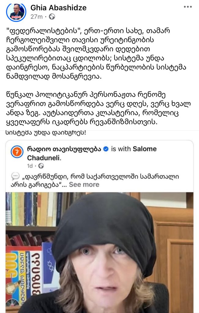 “ფედერალისტების”, ერთ-ერთი სახე, თამარ ჩერგოლეიშვილი თავისი ურეიტინგობის გამოსწორებას შვილმკვდარი დედებით სპეკულირებითაც ცდილობს; სისტემა უნდა დაინგრესო, ნაცპარტიების წურბელობის სისტემა ნამდვილად მოსანგრევია,- წერს ანალიტიკოსი, გია აბაშიძე სოციალურ ქსელში.
