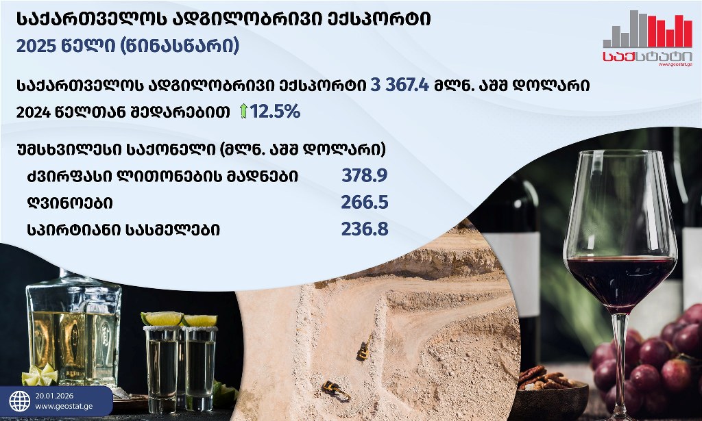 ამასთან, საქსტატის ცნობით, 2025 წელს ადგილობრივი ექსპორტის ათეულში პირველ ადგილზე ძვირფასი ლითონების მადნები და კონცენტრატები არის წარმოდგენილი 378.9 მლნ. აშშ დოლარით, აღნიშნული სასაქონლო ჯგუფის წილი მთლიანი ადგილობრივი ექსპორტის 11.3 პროცენტს შეადგენს. მეორე ადგილზეა ყურძნის ნატურალური ღვინოები, 266.5 მლნ. აშშ დოლარით, ხოლო მესამე ადგილს იკავებს სპირტიანი სასმელები 236.8 მლნ. აშშ დოლარით.