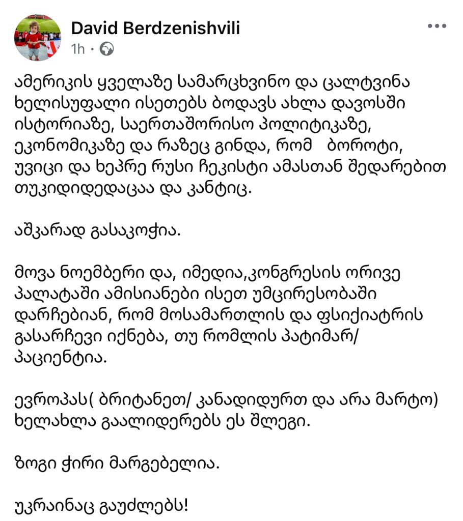 „რესპუბლიკური პარტიის“ დამფუძნებელი, დავით ბერძენიშვილი, აშშ-ის პრეზიდენტის, დონალდ ტრამპის დავოსის მსოფლიო ეკონომიკურ ფორუმზე სიტყვით გამოსვლას აფასებს და ტრამპს “სამარცხვინო და ცალტვინა ხელისუფალს” უწოდებს.