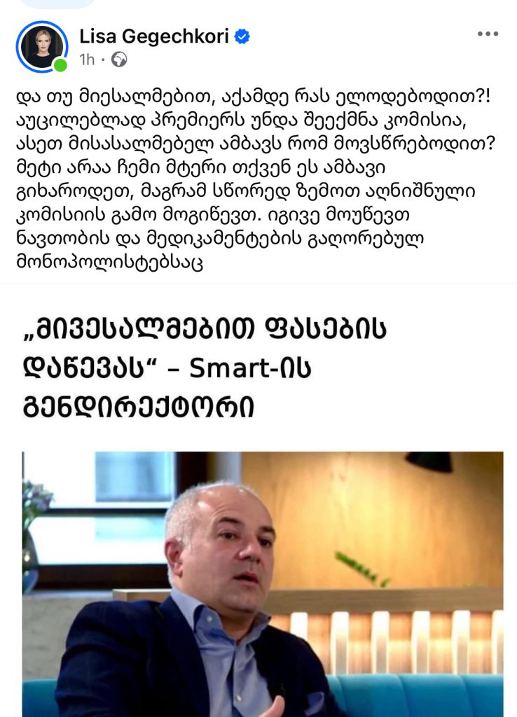 „და თუ მიესალმებით, აქამდე რას ელოდებოდით?! აუცილებლად პრემიერს უნდა შეექმნა კომისია, ასეთ მისასალმებელ ამბავს რომ მოვსწრებოდით? მეტი არაა ჩემი მტერი თქვენ ეს ამბავი გიხაროდეთ, მაგრამ სწორედ ზემოთ აღნიშნული კომისიის გამო მოგიწევთ. იგივე მოუწევთ ნავთობის და მედიკამენტების გაღორებულ მონოპოლისტებსაც”, – წერს გეგეჭკორი Facebook-ზე.