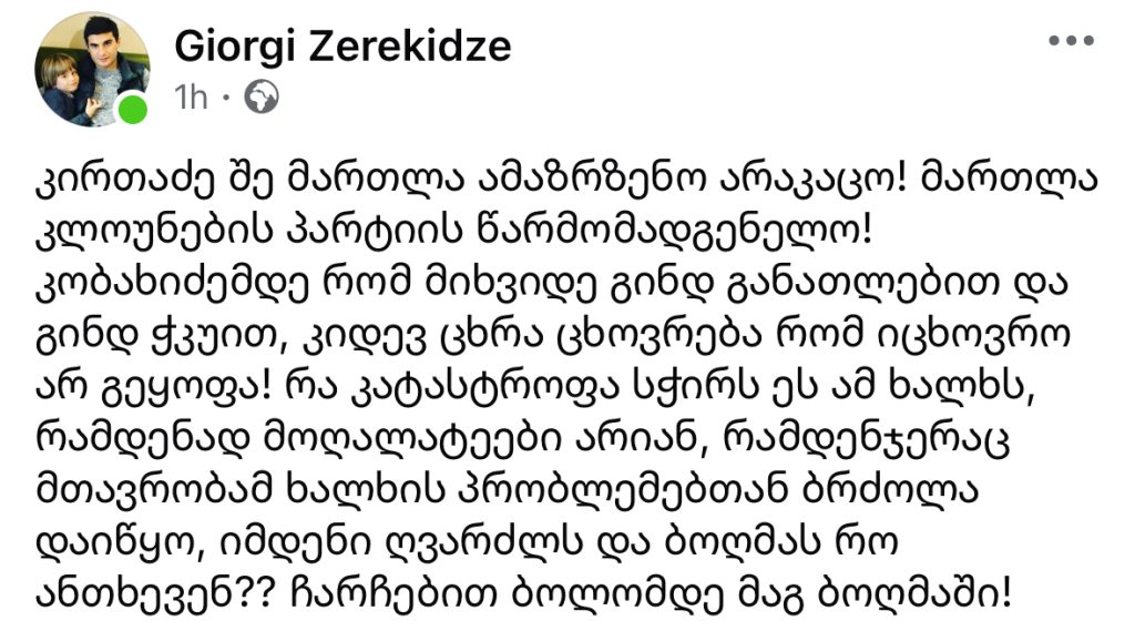 „კირთაძე შე მართლა ამაზრზენო არაკაცო! მართლა კლოუნების პარტიის წარმომადგენელო! კობახიძემდე რომ მიხვიდე გინდ განათლებით და გინდ ჭკუით, კიდევ ცხრა ცხოვრება რომ იცხოვრო არ გეყოფა! რა კატასტროფა სჭირს ეს ამ ხალხს, რამდენად მოღალატეები არიან, რამდენჯერაც მთავრობამ ხალხის პრობლემებთან ბრძოლა დაიწყო, იმდენი ღვარძლს და ბოღმას რომ ანთხევენ? ჩარჩებით ბოლომდე მაგ ბოღმაში!”, – წერს გიორგი ზერეკიძე სოციალურ ქსელში.