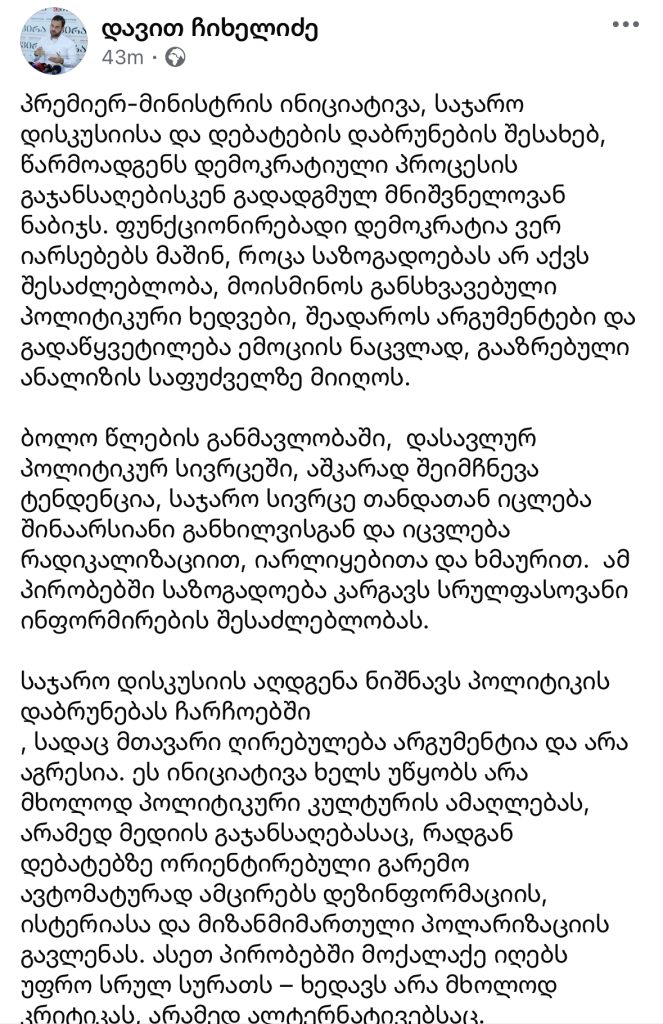 პრემიერ-მინისტრის ინიციატივა, საჯარო დისკუსიისა და დებატების დაბრუნების შესახებ, წარმოადგენს დემოკრატიული პროცესის გაჯანსაღებისკენ გადადგმულ მნიშვნელოვან ნაბიჯს. ფუნქციონირებადი დემოკრატია ვერ იარსებებს მაშინ, როცა საზოგადოებას არ აქვს შესაძლებლობა, მოისმინოს განსხვავებული პოლიტიკური ხედვები, შეადაროს არგუმენტები და გადაწყვეტილება ემოციის ნაცვლად, გააზრებული ანალიზის საფუძველზე მიიღოს, – წერს ექსპერტი დავით ჩიხელიძე სოციალურ ქსელში.