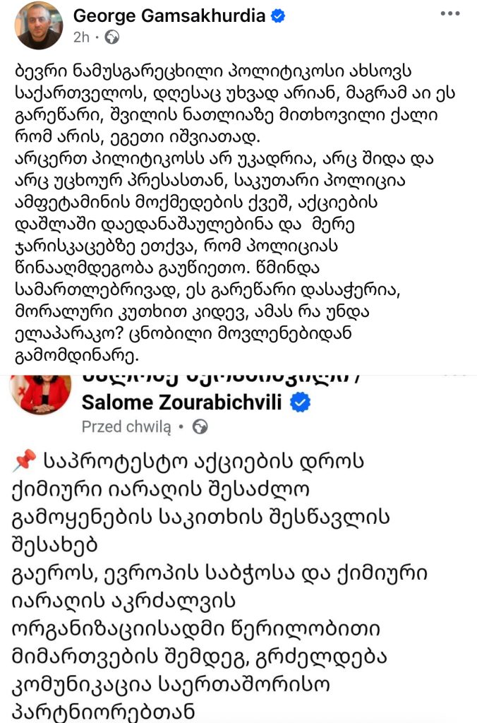 გიორგი გამსახურდია სალომე ზურაბიშვილის მიერ „ფეისბუქზე“ გამოქვეყნებულ პოსტს ეხმიანება – რომ „საპროტესტო აქციების დროს ქიმიური იარაღის შესაძლო გამოყენების საკითხის შესწავლის შესახებ გაეროს, ევროპის საბჭოსა და ქიმიური იარაღის აკრძალვის ორგანიზაციისადმი წერილობითი მიმართვების შემდეგ, გრძელდება კომუნიკაცია საერთაშორისო პარტნიორებთან“. გამსახურდია წერს, რომ „ბევრი ნამუსგარეცხილი პოლიტიკოსი ახსოვს საქართველოს“, მაგრამ როგორიც სალომე ზურაბიშვილია, ასეთი იშვითია.