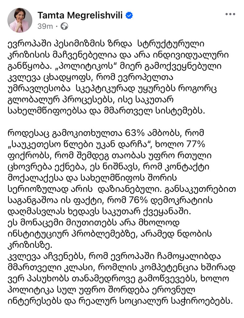 ევროპაში პესიმიზმის ზრდა სტრუქტურული კრიზისის მაჩვენებელია და არა ინდივიდუალური განწყობა. „პოლიტიკოს“ მიერ გამოქვეყნებული კვლევა ცხადყოფს, რომ ევროპელთა უმრავლესობა სკეპტიკურად უყურებს როგორც გლობალურ პროცესებს, ისე საკუთარ სახელმწიფოებსა და მმართველ სისტემებს, – წერს „ხალხის ძალის“ წევრი, თამთა მეგრელიშვილი, სოციალურ ქსელში.