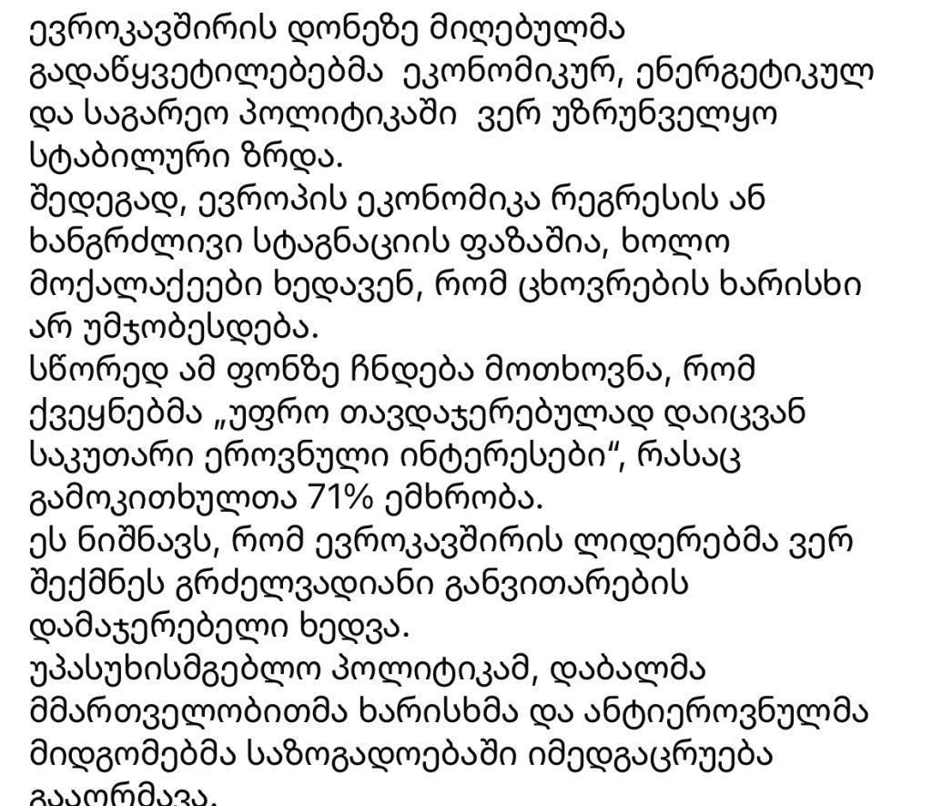 მისი შეფასებით, აღნიშნული ტენდენცია ადასტურებს, რომ ევროკავშირის ლიდერებმა ვერ შესთავაზეს მოქალაქეებს გრძელვადიანი განვითარების დამაჯერებელი ხედვა, უპასუხისმგებლო პოლიტიკამ, დაბალმა მმართველობითმა ხარისხმა და ანტიეროვნულმა მიდგომებმა კი საზოგადოებაში იმედგაცრუება კიდევ უფრო გააღრმავა.