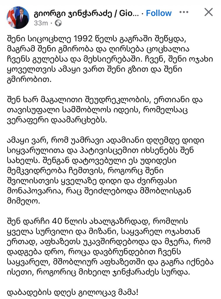 აფხაზეთის ავტონომიური რესპუბლიკის მთავრობის თავმჯდომარე გიორგი ჯინჭარაძე სოციალურ ქსელში პოსტს აქვეყნებს.