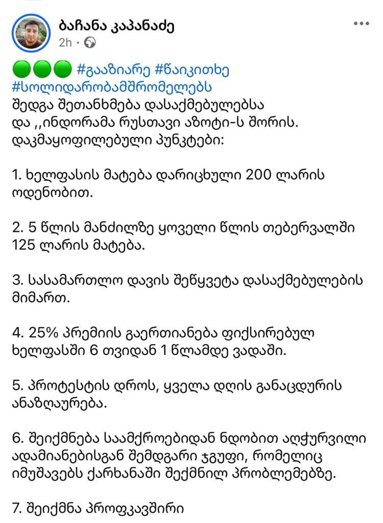 შედგა შეთანხმება დასაქმებულებსა და ,,ინდორამა რუსთავი აზოტი-ს შორის, – ამის შესახებ „რუსთავის აზოტის“ თანამშრომელი, ბაჩანა კაპანაძე, სოციალურ ქსელში წერს.