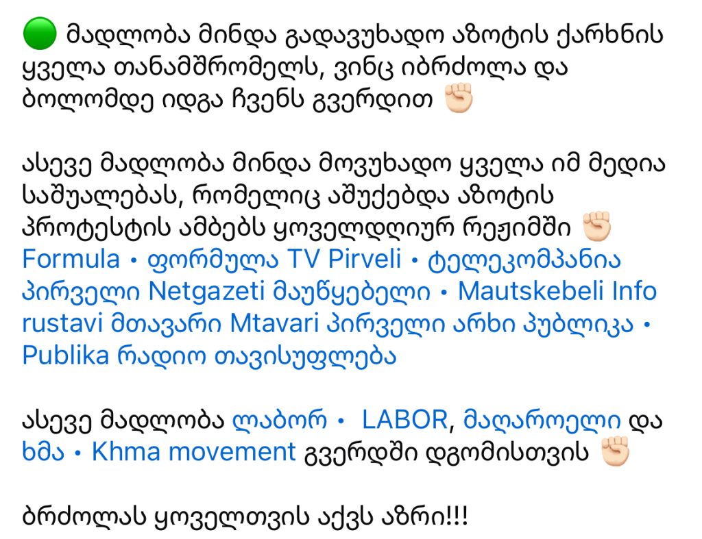მადლობა მინდა გადავუხადო აზოტის ქარხნის ყველა თანამშრომელს, ვინც იბრძოლა და ბოლომდე იდგა ჩვენს გვერდით,” – წერს ბაჩანა კაპანაძე სოციალურ ქსელში.