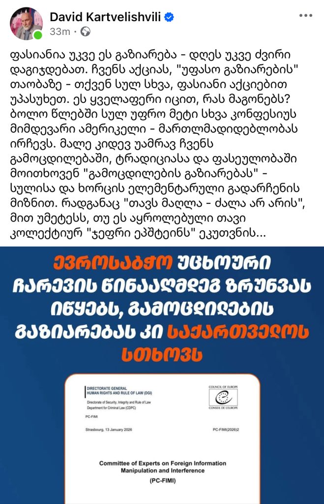 „ფასიანია უკვე ეს გაზიარება – დღეს უკვე ძვირი დაგიჯდებათ. ჩვენს აქციას, „უფასო გაზიარების“ თაობაზე, თქვენ სულ სხვა, ფასიანი აქციებით უპასუხეთ. ეს ყველაფერი იცით, რას მაგონებს? ბოლო წლებში სულ უფრო მეტი სხვა კონფესიების მიმდევარი ამერიკელი – მართლმადიდებლობას ირჩევს. მალე კიდევ უამრავ ჩვენს გამოცდილებაში, ტრადიციასა და ფასეულობაში მოითხოვენ „გამოცდილების გაზიარებას“, სულისა და ხორცის ელემენტარული გადარჩენის მიზნით. რადგანაც „თავს მაღლა, ძალა არ არის“, მით უმეტესს, თუ ეს აყროლებული თავი კოლექტიურ „ჯეფრი ეპშტეინს“ ეკუთვნის…“ – წერს დავით ქართველიშვილი.