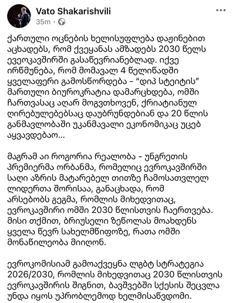 მგონი, ამ ყველაფრის შემდეგ, ლეგიტიმურია კითხვა – ასეთი მომავლისთვის ამზადებს ხელისუფლება ქვეყანას, როდესაც აცხადებს, რომ 2030 წელს საქართველოს ევროკავშირში გააწევრიანებს…?“, – წერს ვატო შაქარიშვილი.
