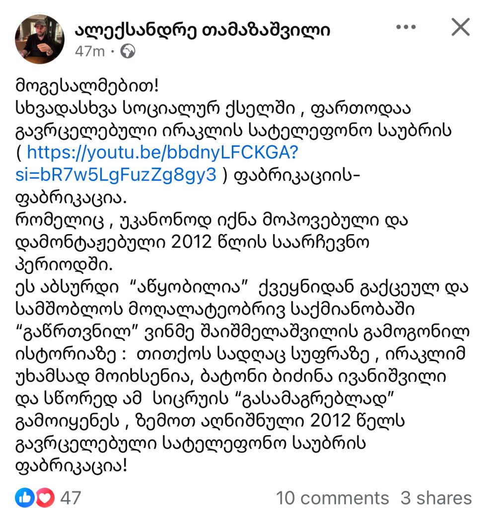 “ეს აბსურდი “აწყობილია” ქვეყნიდან გაქცეულ და სამშობლოს მოღალატეობრივ საქმიანობაში “გაწრთვნილ” ვინმე შაიშმელაშვილის გამოგონილ ისტორიაზე”