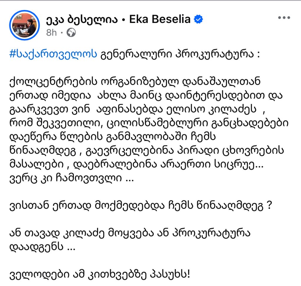 ეკა ბესელია სოციალურ ქსელში პოსტს აქვეყნებს.
