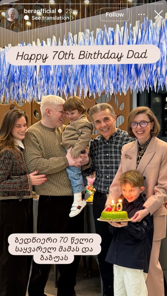 საზოგადოება ბერა ივანიშვილი ბიძინა ივანიშვილს დაბადების დღეს ულოცავს 18.02.2026 20:31:32 ShareTweetSharePin ბერა ივანიშვილი ოჯახთან ერთად გადაღებულ ფოტოს აქვეყნებს და ბიძინა ივანიშვილს დაბადების დღეს ულოცავს. ცნობილი ქველმოქმედი და “ქართული ოცნების” დამაარსებელი ბიძინა ივანიშვილი დღეს 70 წლის გახდა. კომენტარები ShareTweetSharePin ნანახია: 7 ჯერ
