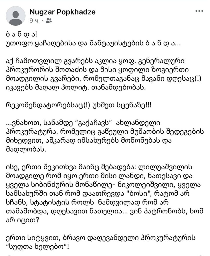 ნუგზარ ფოფხაძე: უთოფო ყაჩაღებისა და შანტაჟისტების ბ ა ნ დ ა ს, აკლია ყოფილი გენერალური პროკურორის შოთაძის და მისი ყოფილი მოადგილის გვარები