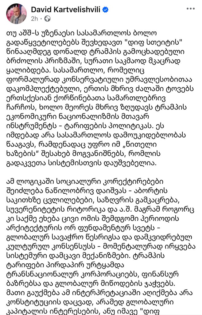 უზენაესი სასამართლო ამ სცენარში არ არის პრეზიდენტის ინსტრუმენტი, არამედ ღრმა ინფრასტრუქტურის ნაწილი, რომელიც განსაზღვრავს, რამდენად შორს შეიძლება წავიდეს პოლიტიკური ცვლილება,“ – წერს დავით ქართველიშვილი.