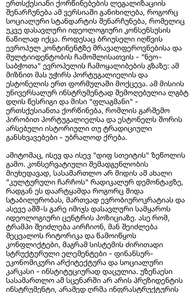 ამიტომაც, ისევ და ისევ „დიფ სთეითის“ ზეწოლის გამო. კონსერვატიული შემადგენლობის მიუხედავად, სასამართლო არ მიდის ამ ახალი „კულტურული ჩარჩოს“ რადიკალურ დემონტაჟზე, რადგან ეს დაარტყამდა როგორც შიდა სტაბილურობას, მართვად ევრობიუროკრატიას და ასევე აშშ-ს გარე იმიჯს დასავლური სამყაროს იდეოლოგიური ცენტრის პოზიციაზე. ასე რომ, ტრამპი შეიძლება აირჩიონ, მან შეიძლება შეცვალოს რიტორიკა და წამოიწყოს კონფლიქტები, მაგრამ სისტემის ძირითადი სტრუქტურული ელემენტები – ფინანსურ-ეკონომიკური არქიტექტურა და სოციალური კარკასი ინსტიტუციურად დაცულია.