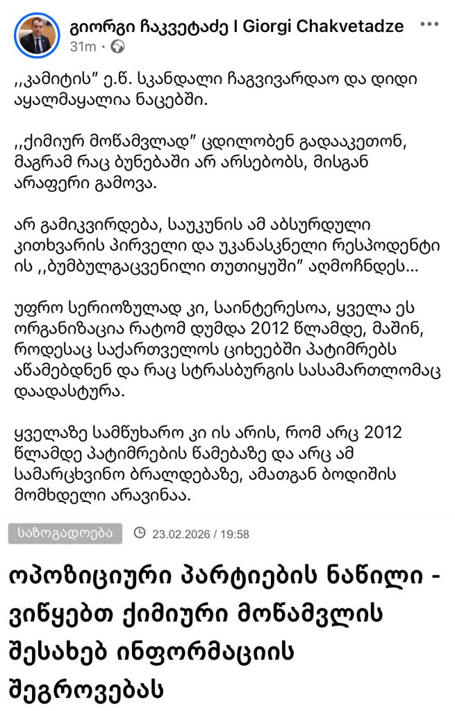 განათლების, მეცნიერებისა და ახალგაზრდულ საქმეთა კომიტეტის თავმჯდომარის პირველი მოადგილე გიორგი ჩაკვეტაძე გავრცელებულ ცნობას იმის თაობაზე, რომ ოპოზიციური პარტიების ნაწილი ქიმიური მოწამვლის შესახებ ინფორმაციის შეგროვებას იწყებს, სოციალურ ქსელში ეხმაურება და ამბობს, რომ “რაც ბუნებაში არ არსებობს, მისგან არაფერი გამოვა”.