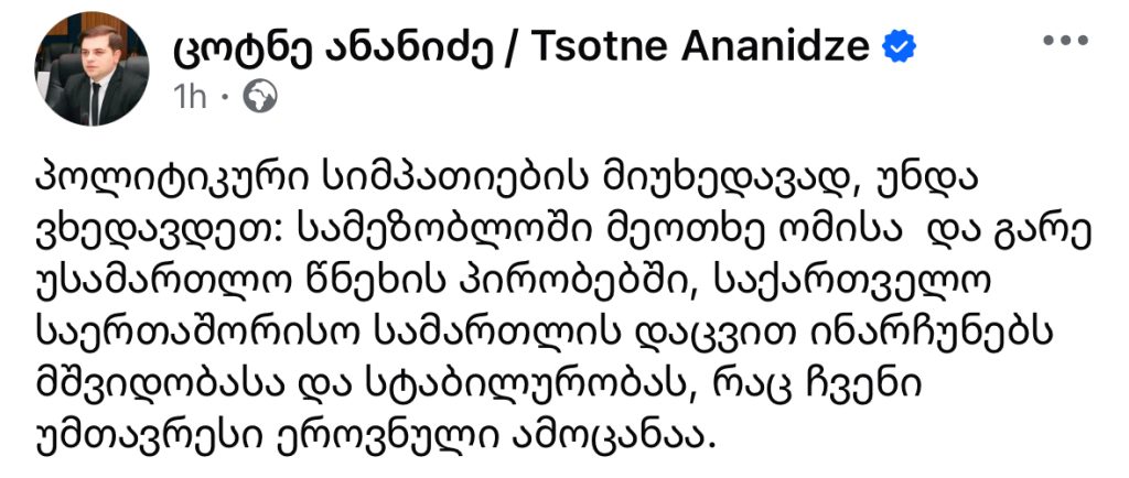„პოლიტიკური სიმპათიების მიუხედავად უნდა ვხედავდეთ: სამეზობლოში მეოთხე ომისა და გარე უსამართლო წნეხის პირობებში, საქართველო საერთაშორისო სამართლის დაცვით ინარჩუნებს მშვიდობასა და სტაბილურობას, რაც ჩვენი უმთავრესი ეროვნული ამოცანაა,” – წერს ანანიძე.