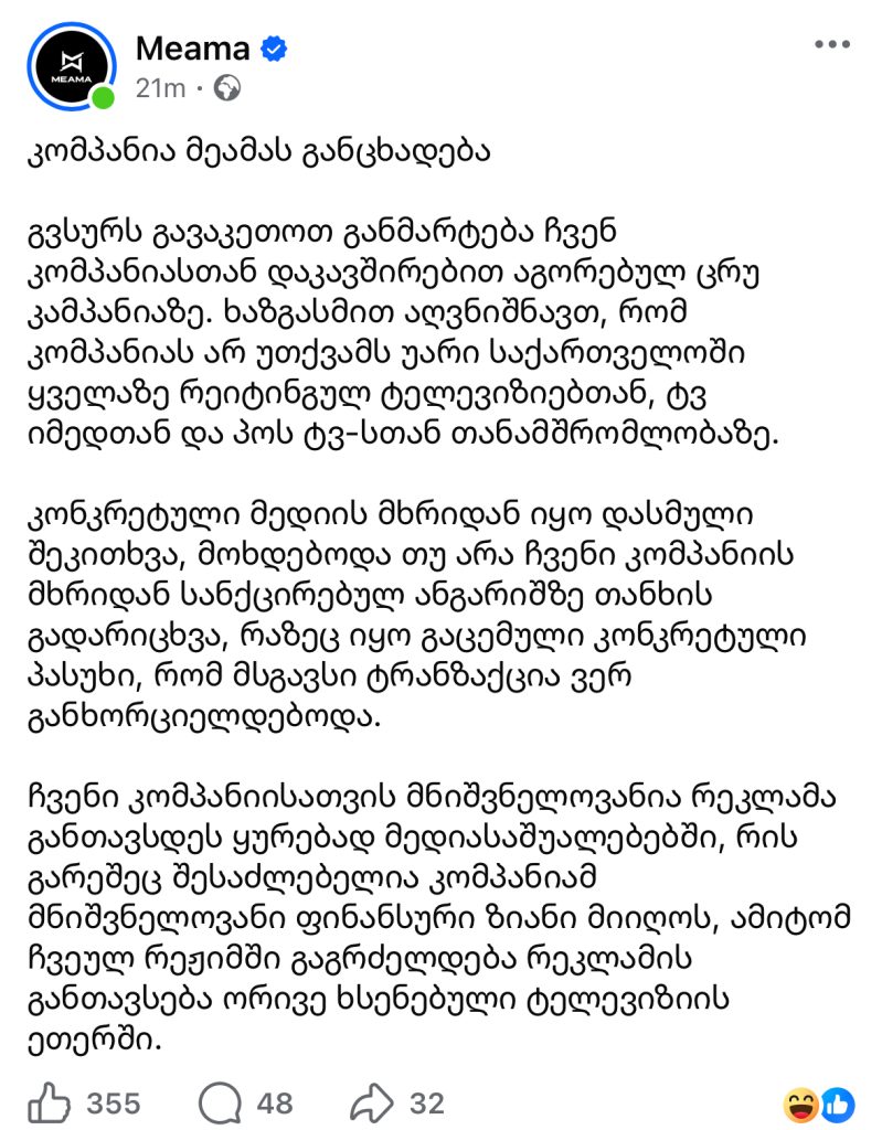 კომპანიას არ უთქვამს უარი საქართველოში ყველაზე რეიტინგულ ტელევიზიებთან, ტვ იმედთან და პოს ტვ-სთან თანამშრომლობაზე , – განცხადებას კომპანია „მეამა“ სოციალურ ქსელში აქვეყნებს.